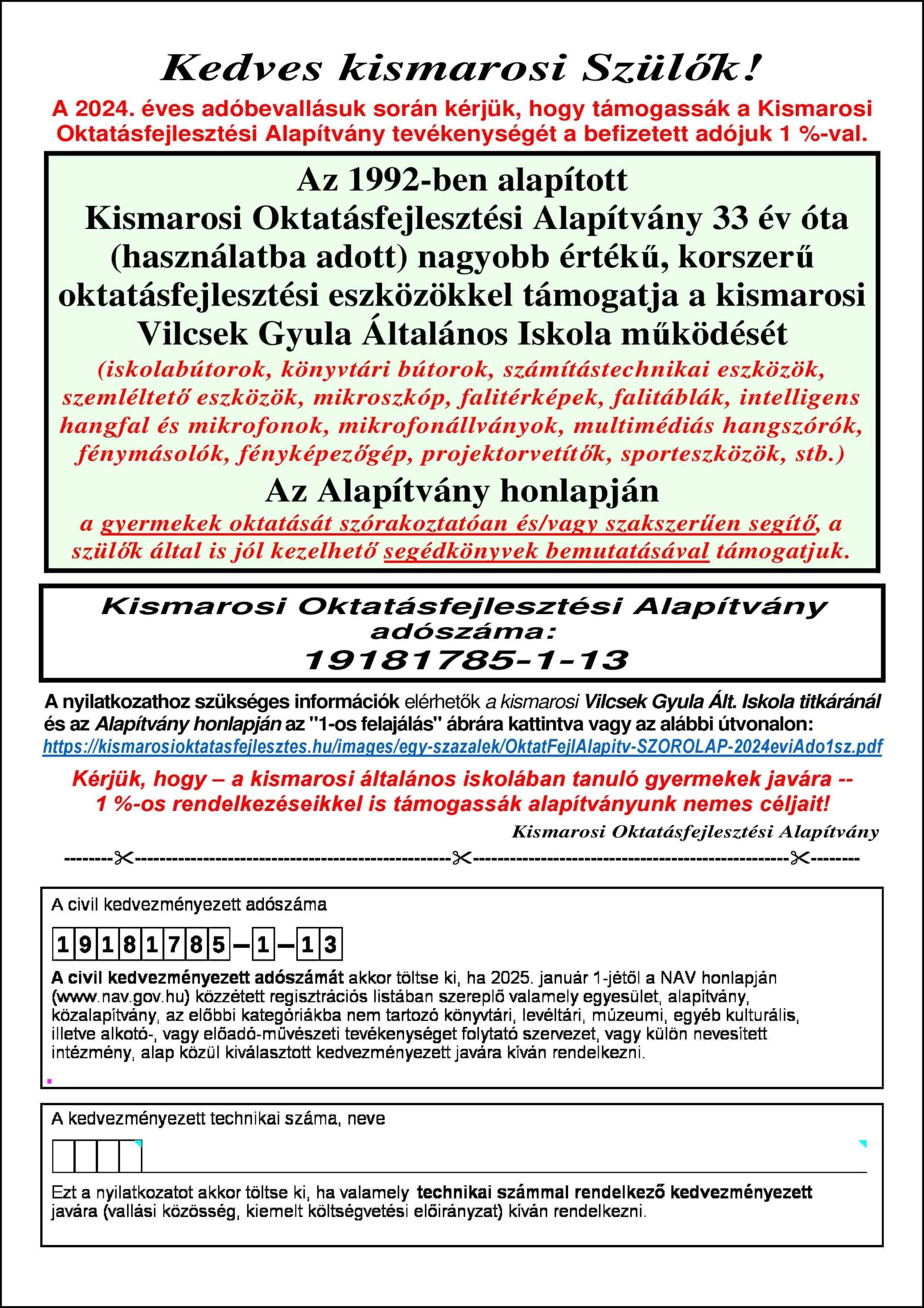 A 2024. adóévre vonatkozó adóbevallásuk során kérjük, hogy támogassák a Kismarosi Oktatásfejlesztési Alapítvány tevékenységét a befizetett adójuk 1 %-val.