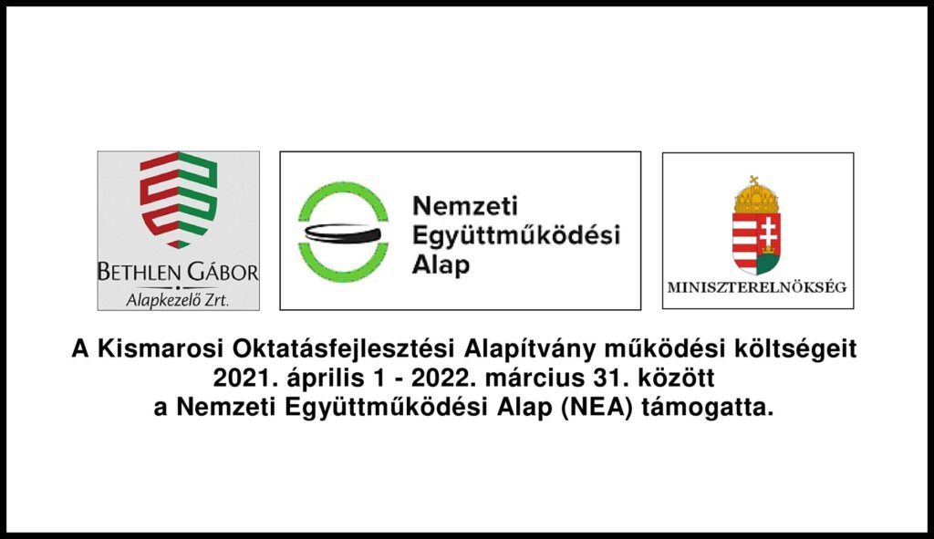 Tájékoztatásul közöljük, hogy a Kismarosi Oktatásfejlesztési Alapítvány működési költségeit 2022.ápr.1. – 2023.márc.31., 2023.ápr.1. – 2024.márc.31. és 2024.ápr.1. – 2025.márc.31. között a Nemzeti Együttműködési Alap (NEA) is támogatta.